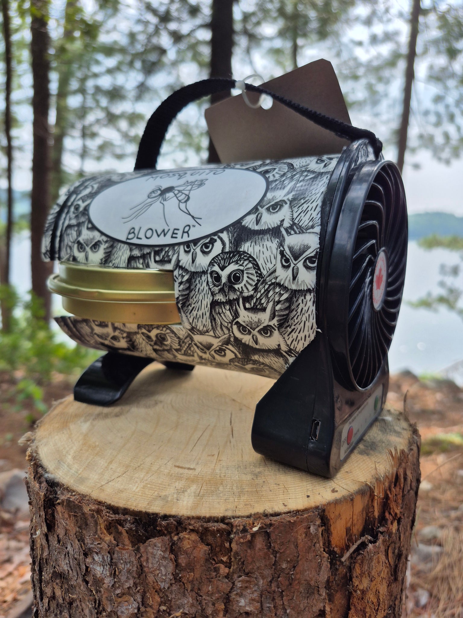 Mosquito Blower that is designed to use mosquito coil pics for controlling mosquitoes, with a specific emphasis on being an outdoor product made in northern Ontario. The use of a mosquito coil holder with a special groove and lock- in system for the coil holder is highlighted as a user-friendly feature.